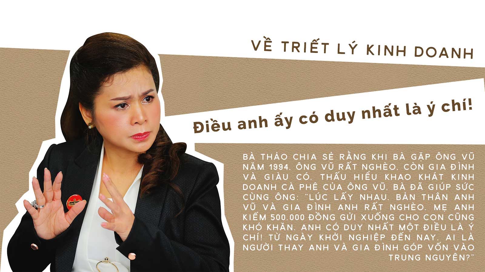 Vợ chồng ông Vũ – bà Thảo là những doanh nhân nổi tiếng tạo thương hiệu cà phê Trung Nguyên và cà phê hòa tan Trung Nguyên (G7). Trong đó, ông Vũ là người đã được tạp chí National Geographic Traveller và và tạp chí Fobers Asia vinh danh là “Vua cà phê Việt Nam”.