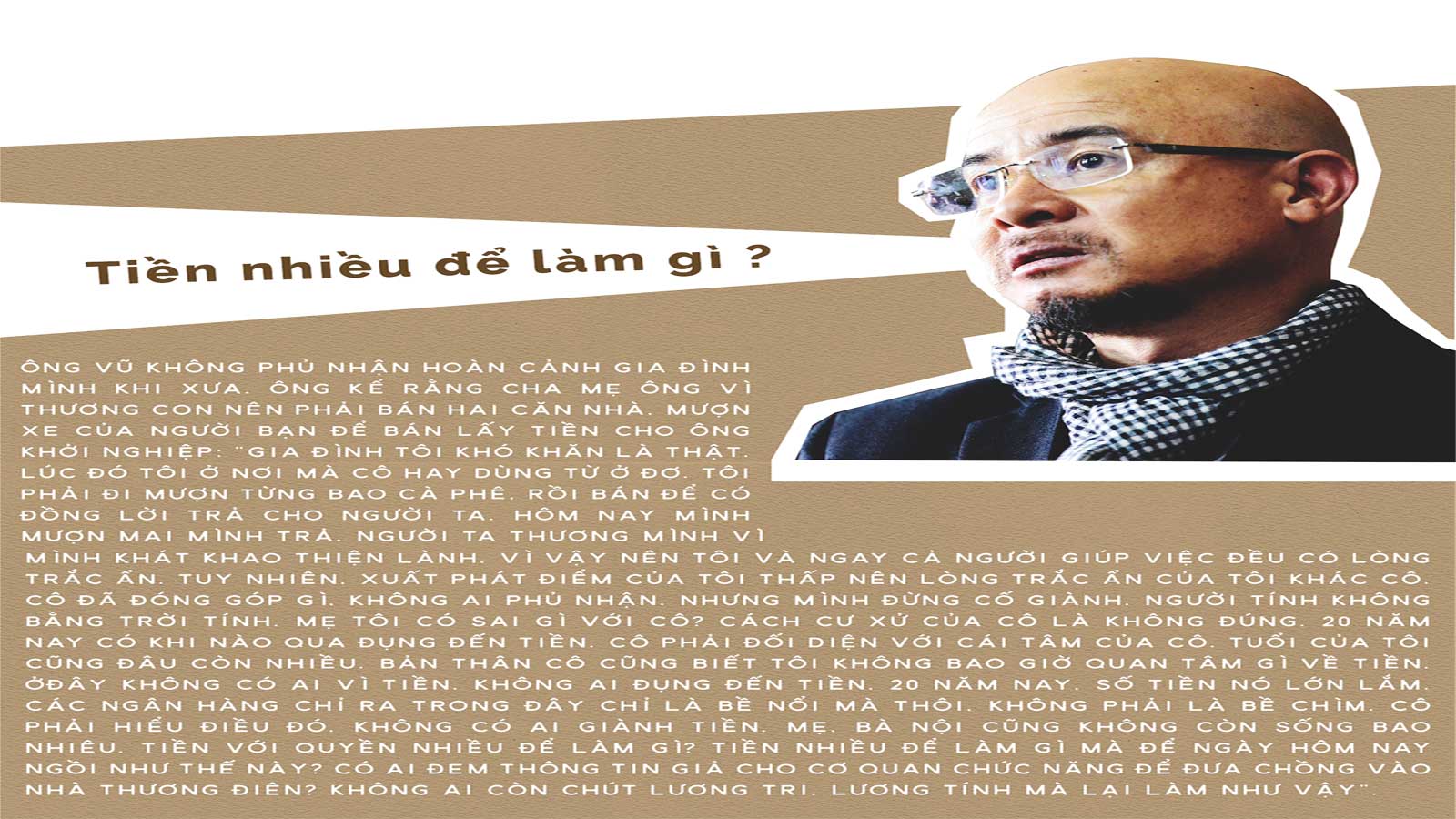 Ông Vũ: “Tình cảm của các cháu tôi ghi nhận. Cái này không cần thiết. Tôi nói với các con của tôi, không phải 5% hay là bao nhiêu phần trăm. Bà nội của con hiện nay 70 tuổi rồi, không ai mà muốn tiền bạc hết. Ba cũng vậy. Chỉ có mẹ của con là khác. Nói những điều phải không nghe. Giờ dẫn ra đây, đứng trước toà nói những thứ như vậy. Bịa ra, rồi những người anh em lại đi bảo vệ cho những thứ bịa ra như vậy. Không ai tưởng tượng nổi. Đừng có lôi các con vào chuyện này. Tôi nói bằng cái tâm của tôi. Còn lá thư đó là chứng cớ mà mẹ nó nêu. Mẹ nó đủ chuyện để làm, chứ không phải là chuyện lá thư này không. Tôi nói bằng cái lòng người cha. Cô đó cũng biết rằng tôi chưa bao giờ sai với cô cả”.
